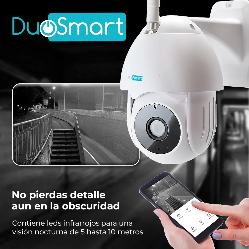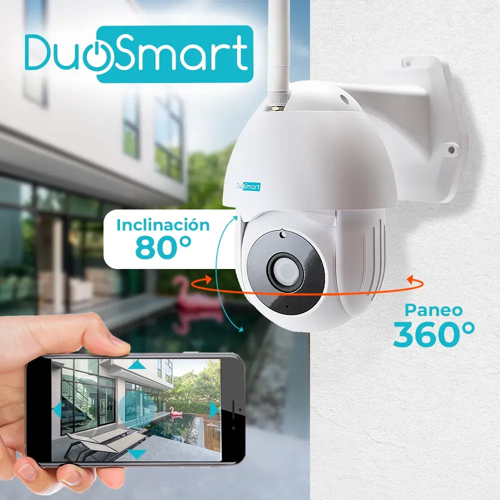 CAMARA INTELIGENTE PT DUOSMART E70 WIFI 2.4 GHZ PARA EXTERIOR CON AUDIO BIDIRECCIONAL TIPO DOMO 3MP CON MOVIMIENTO SEGUIDOR DE PERSONAS Y VISION NOCTURNA COMPATIBLE CON APP DUOSMART SOPORTA MEMORIA MICROSD DE HASTA 128 GB (NO INCLUIDA)