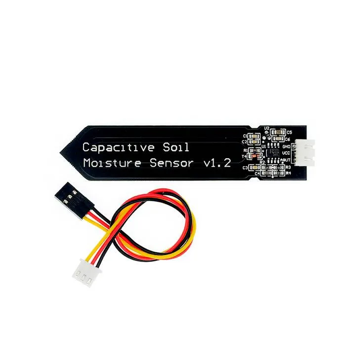 Este sensor de humedad del suelo capacitivo analogico mide los niveles de humedad del suelo mediante deteccion capacitiva.
